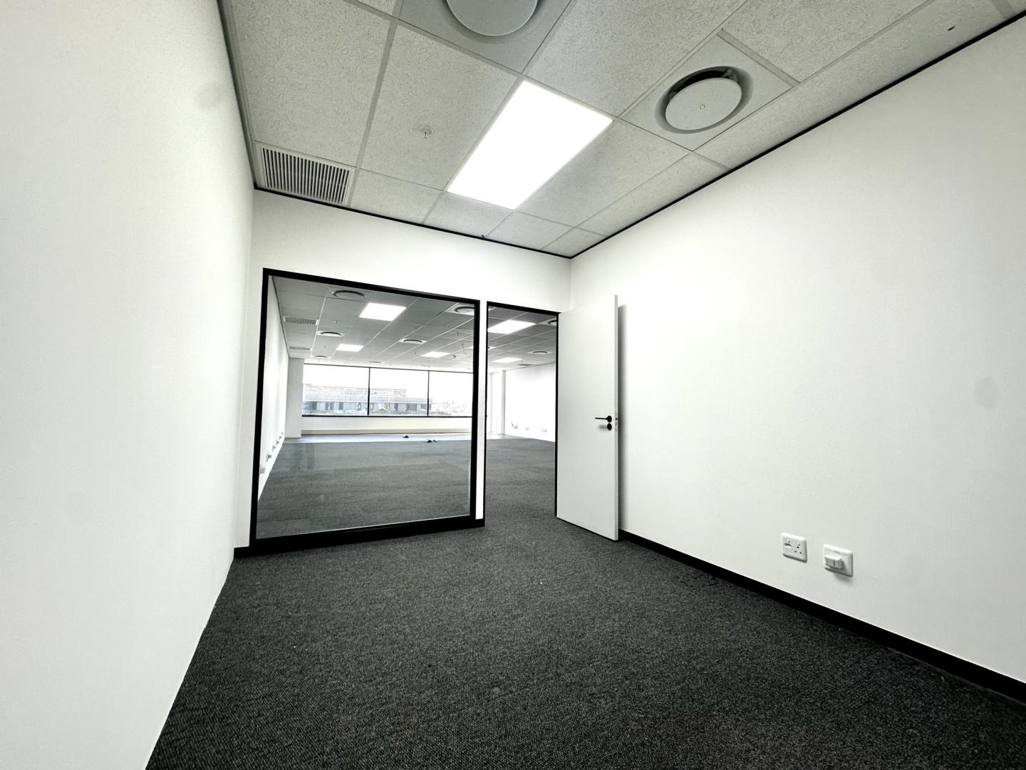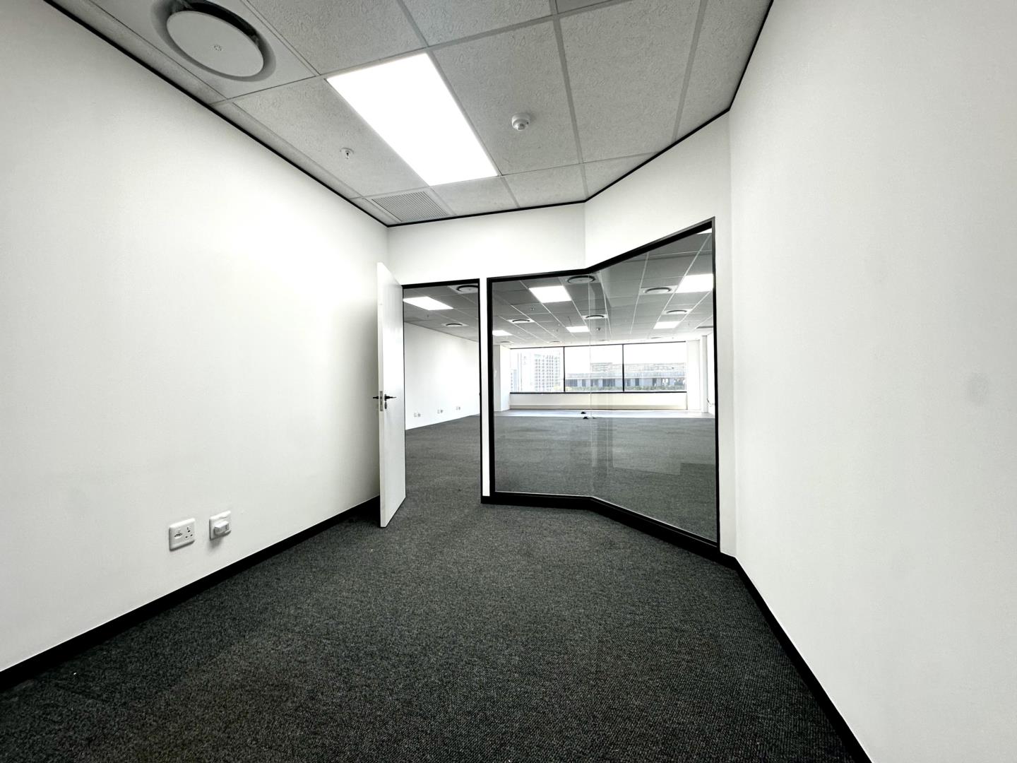 The office features a reception area, two private offices, and a spacious open-plan work area with large windows offering views over the Menlyn Maine precinct. The building includes advanced security, energy-efficient design, and a professional corporate environment ideal for growing businesses.