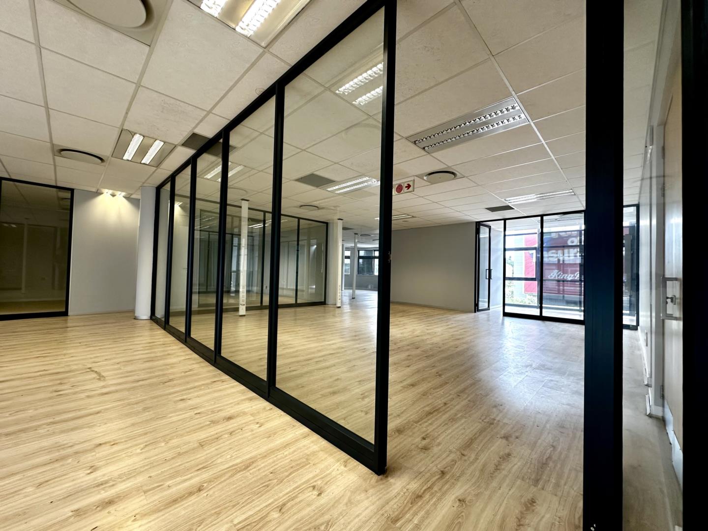 The office offers a versatile layout with a mix of open-plan and private offices, complemented by glass partitioning that enhances natural light and creates a contemporary feel. The space includes a reception area, boardrooms, a kitchenette/canteen, and two private balconies, ideal for breakaway areas or informal meetings.