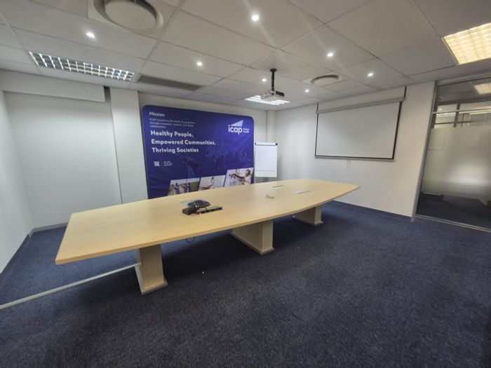 Office space of 255 m² with reception, boardroom, two offices, and open-plan area near Gautrain station.